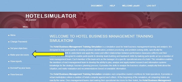 Now, you are ready to login and start using the Hotel Business Management Training Simulation game. After you successfully login the Hotel Business Management Training Simulation game, you will see main menu on the left.